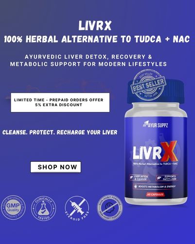 LIVRX is a 100% herbal alternative to TUDCA + NAC, crafted to cleanse, protect, and recharge your liver naturally.Powered by Ayurvedic herbs that support detoxification, metabolism, and liver regeneration — LIVRX bridges the gap between modern liver science and ancient healing wisdom.Whether you’re a gym-goer, alcohol consumer, or recovering from stress or illness, LIVRX helps your liver recover, regenerate, and perform at its peak.